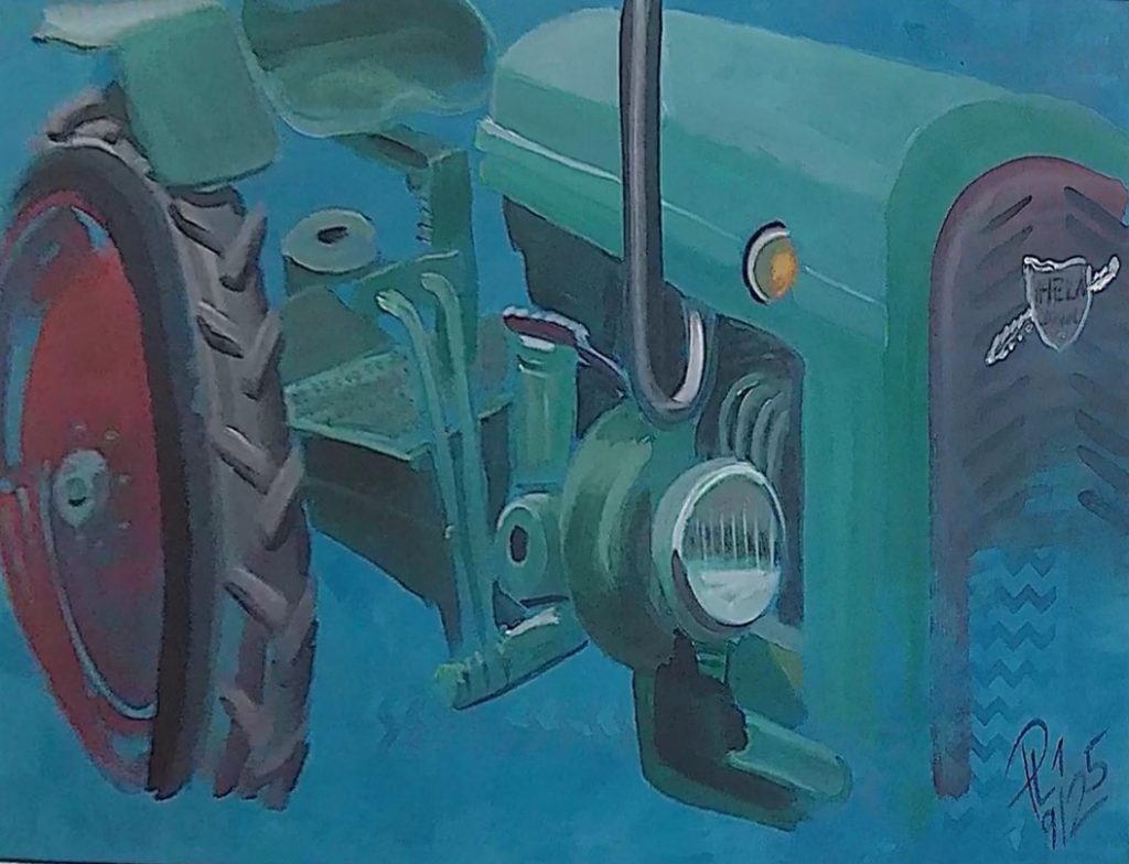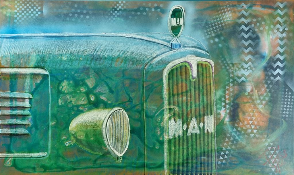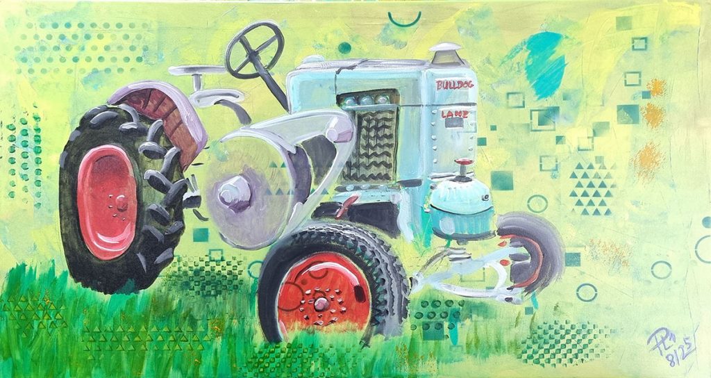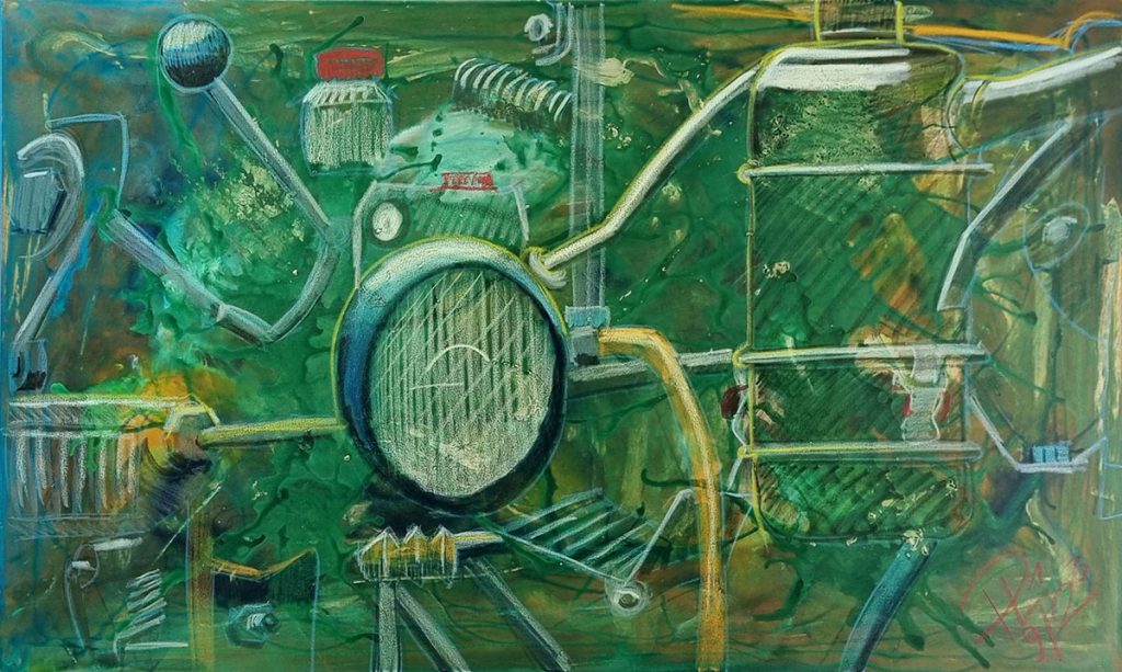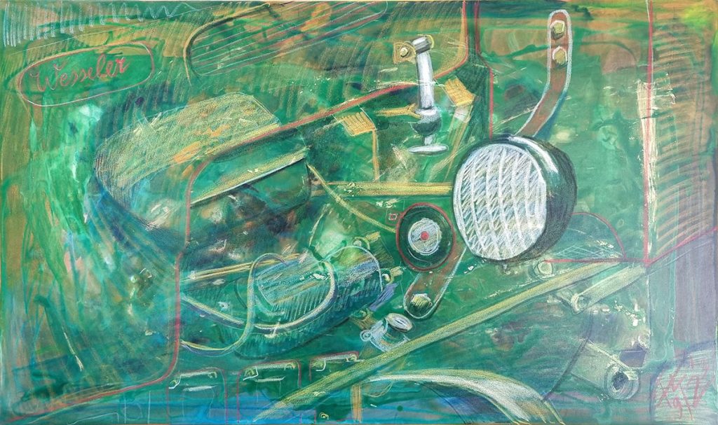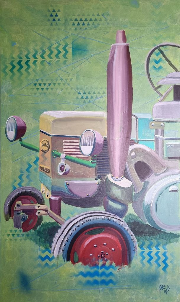abstrahierte Details von alten Traktoren in MixedMedia-Technik auf Leinwänden